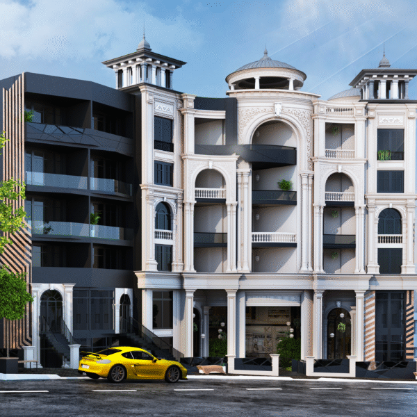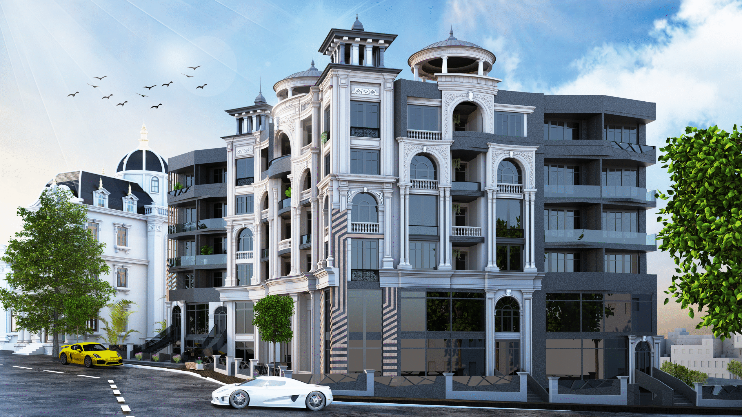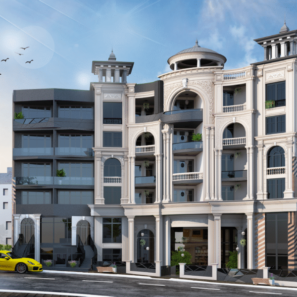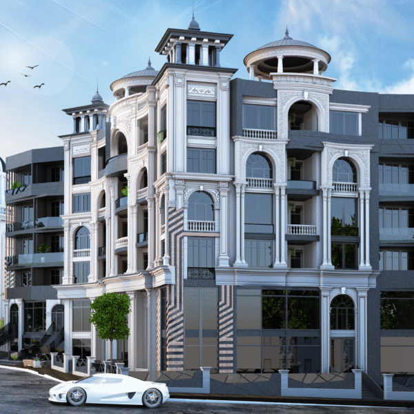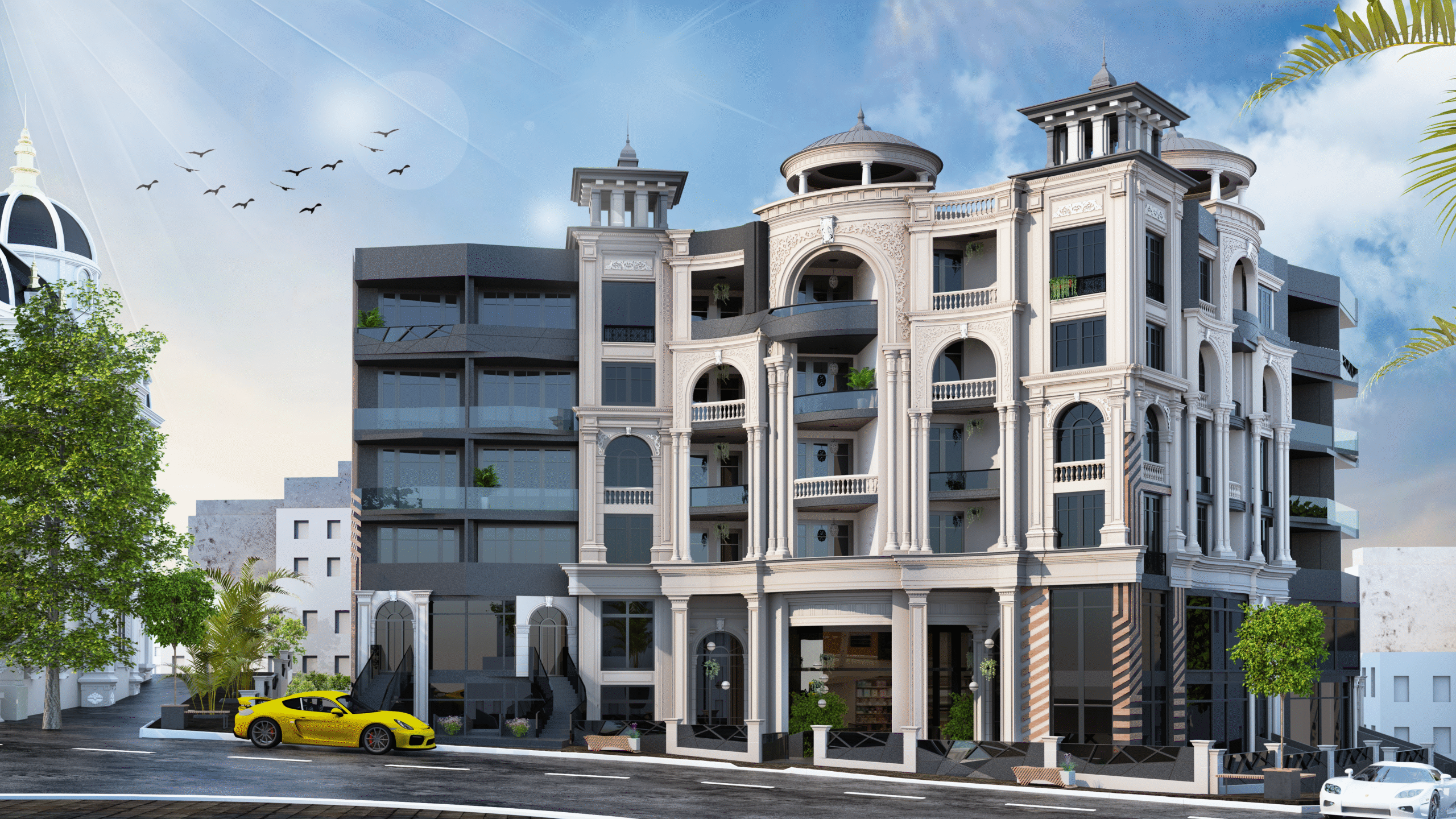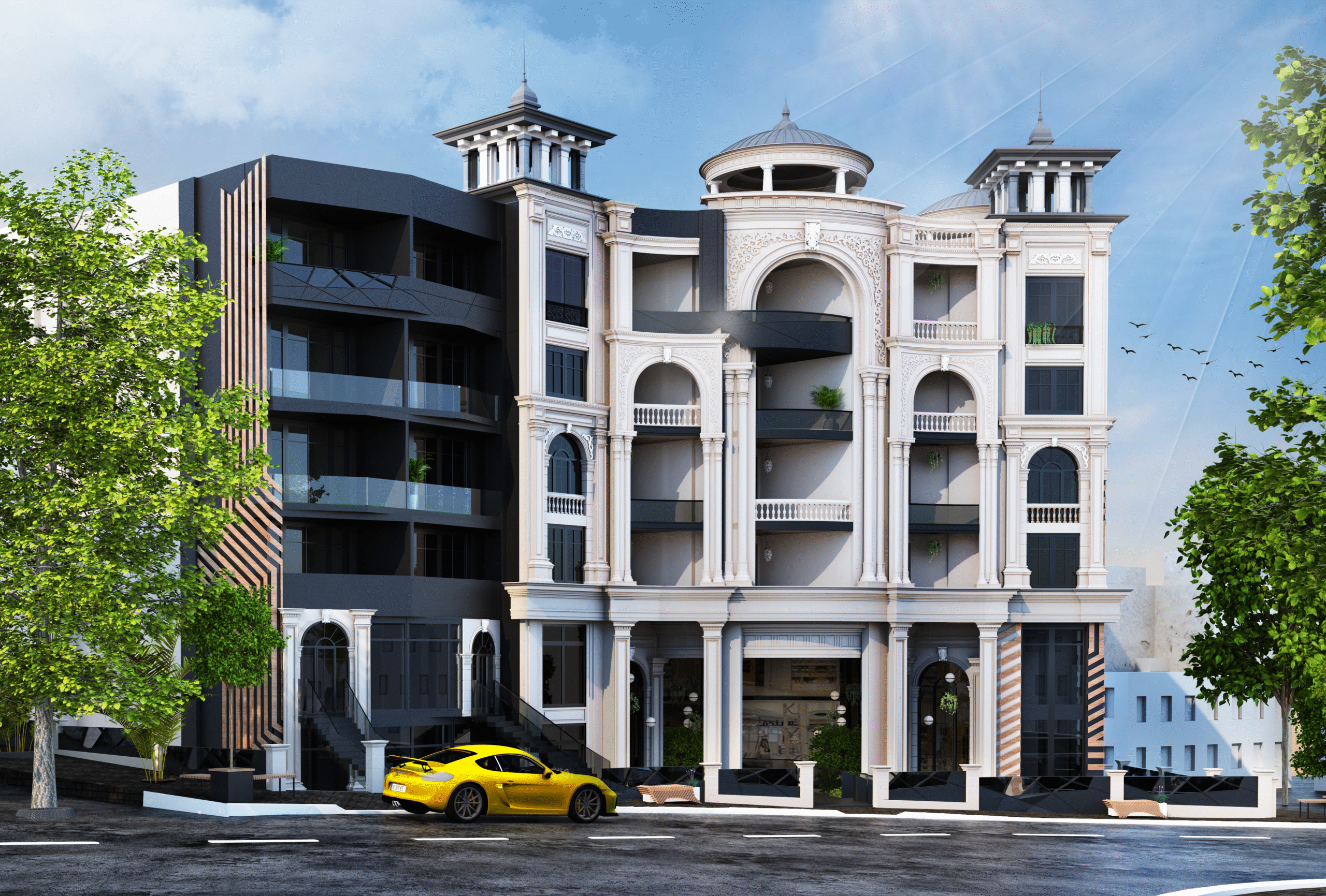 • واجهة تجمع بين فخامة الكلاسيكية وأناقة العصرية، بتصميم نيو كلاسيك يعكس الذوق الرفيع ويمنح المبنى حضورًا مميزًا يلفت الأنظار.