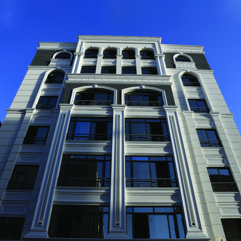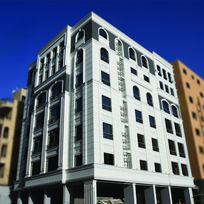 - Saraya 12 is designed in a distinctive Neo-Classic style, featuring a facade that blends white tones with grey brick, elegant columns inspired by Islamic architecture, and balconies with open views. The architectural concept reflects a refined balance between authenticity and modern design, making it ideal for those seeking luxury apartments in Mokattam.