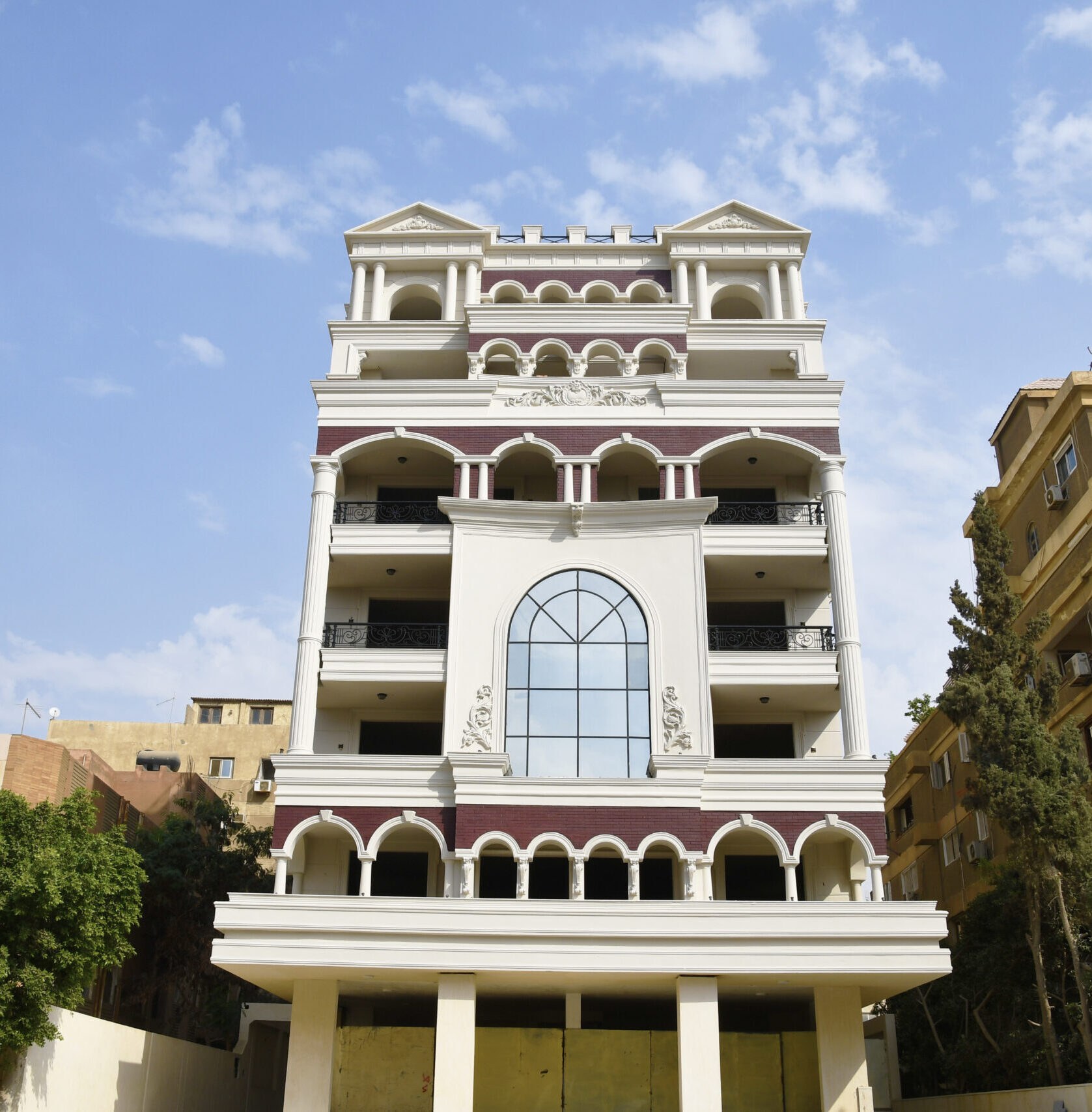 - Saraya 7 was designed in the Neo-Classical style with an innovative façade that combines white paint and English stone, along with columns inspired by Islamic architecture and balconies offering distinctive views of the area.